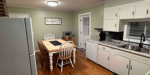 The kitchen at Pappy's Trail House is well-equipped for all your culinary needs, featuring a Keurig coffee bar for your morning brew, a dishwasher for easy cleanup, a cook stove for preparing meals, a microwave for quick heating, and a refrigerator for storing all your food and beverages. This setup ensures that you have everything you need to enjoy great meals with your group during your stay.